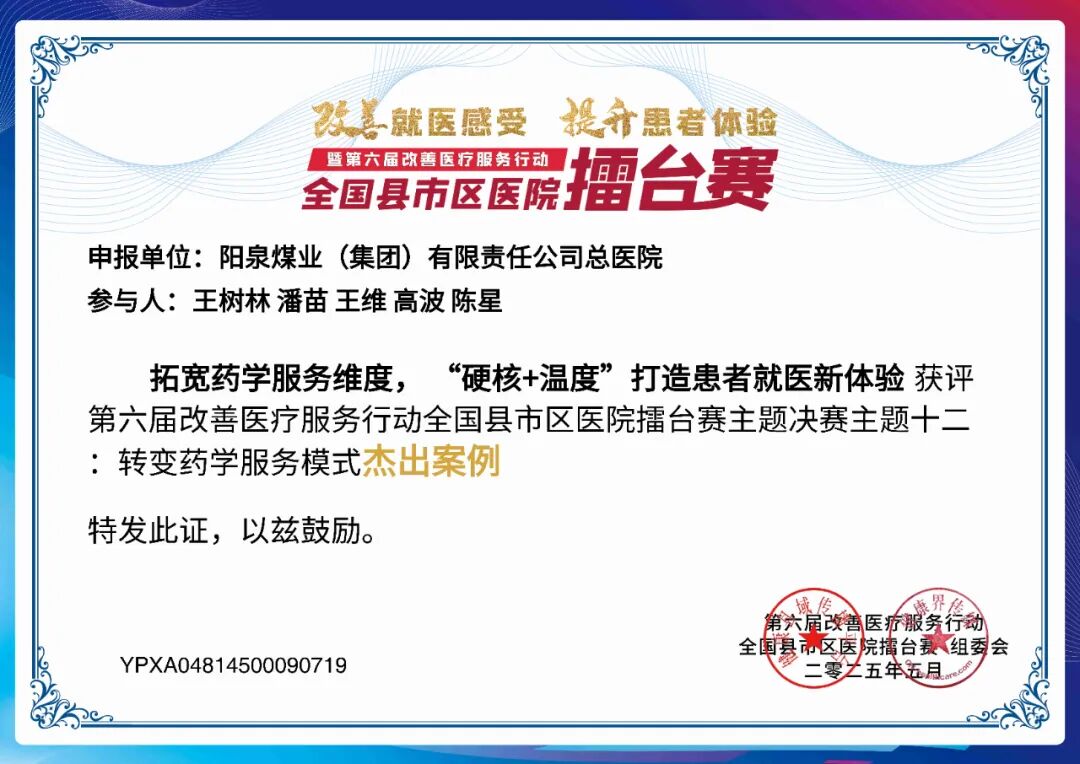 近日,由国家卫生健康委医政医管局指导,健康界、健康县域传媒联合主办的第六届改善医疗服务全国县市医院擂台赛最终榜单揭晓。阳煤总医院药学部选送的《拓宽药学服务维度,“硬核+温度”打造患者就医新体验》案例,在“转变药学服务模式”主题赛中脱颖而出,荣获全国“杰出案例”。