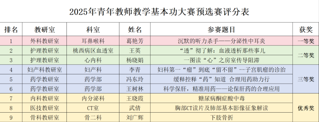 郭瑞斌现场宣布比赛成绩并作总结讲话。他对参赛选手的优异表现给予充分肯定,强调实习阶段是学生将理论知识与临床实践相结合的关键环节,要求带教教师夯实教学基本功,严格遵循教学大纲开展授课。希望入围决赛的两名青年教师认真准备,力争在集团比赛中取得优异成绩,为医院争光添彩。