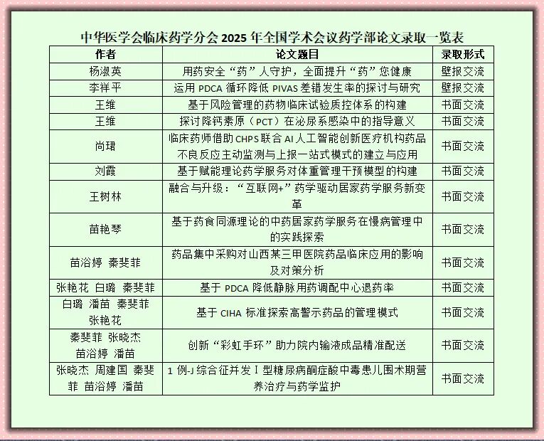 近日,中华医学会临床药学分会2025年全国学术会议论文评审结果正式公布,阳煤总医院药学部投递的论文中共13篇被大会录用,其中2篇选为壁报交流,11篇收录为书面交流。这一成绩不仅刷新了药学部在全国学术会议上的最佳纪录,更为医院高质量发展增添浓墨重彩一笔。 壁报交流,闪耀学术舞台 在本次大会上,杨淑英药师撰写的《用药安全“药”人守护,全面提升“药”您健康》和李祥平护士撰写的《运用PDCA循环降低PIVAS差错发生率的探讨与研究》,在众多论文中脱颖而出,成功入选壁报交流环节。这两篇论文在会议期间通过壁报形式向全国专家学者展示,成为传播我院药学科研成果的重要窗口,也为同行间的深入探讨与灵感碰撞提供了宝贵机会。 书面交流,展现多元创新 此外,药学部药师王维、尚珺、王树林、张晓杰、刘霞、苗艳琴、苗浴婷、秦斐菲、张艳花、白璐等的11篇论文被收录为书面交流。这些论文涵盖药物临床试验质控、药品不良反应监测、居家药学服务、慢病管理等多个前沿领域,充分体现了我院药学部在临床药学实践与科研创新中的多元化探索与丰硕成果。 精心组织,铸就团队辉煌 这一成绩的取得离不开药学部的精心组织与全体同仁的共同努力。在药学部副主任潘苗的积极组织推动下,团队历时3个月完成论文撰写、复稿修改与投递工作。最终13篇论文均通过大会严格的“双盲”评审被录用,刷新我院有史以来被全国学术会议录用的最好成绩。这不仅是对药学团队科研能力的肯定,更是我院长期重视学科建设、支持学术创新的生动体现。 展望未来,携手再攀高峰 中华医学会是我国医学领域规模最大、影响力最深远的学术团体之一,其年度征文活动始终以“推动医学创新、促进学术交流、服务健康中国”为宗旨,汇聚了全国各级医疗机构、科研院所的顶尖医学人才与最新研究成果,征文涵盖了临床药学、药物研发、合理用药监测、药事管理等多个细分领域,竞争尤为激烈。展望未来,药学部将以此为新起点,秉持严谨求实的科研态度,深耕临床药学实践,推动更多高质量研究成果的产出。同时,以更加开放的姿态参与国内外学术交流,为提升医疗服务品质、促进药学事业高质量发展贡献智慧与力量。 供 稿:王树林