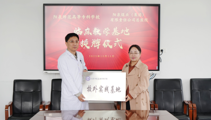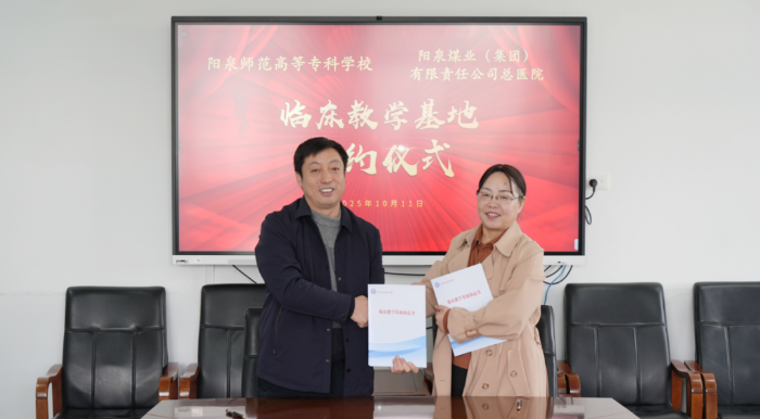 10月11日上午,阳泉师范高等专科学校(以下简称“阳泉师专”)与阳泉煤业(集团)有限责任公司总医院(以下简称“阳煤集团总医院”),就康复治疗技术专业共建临床教学基地,举行签约暨授牌仪式。