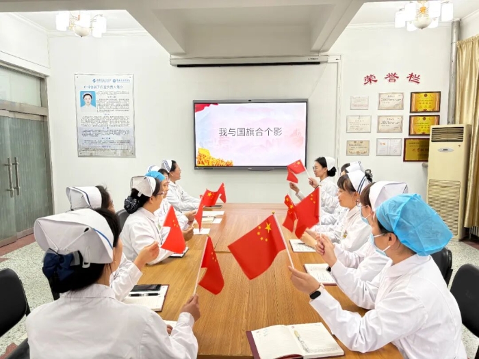 活动首先通过观看珍贵的历史影像资料,带领全体党员回顾了波澜壮阔的抗日战争。艰苦卓绝的岁月与革命先辈的英勇无畏,让在场的每一位党员深刻体会到今天的和平幸福来之不易,更加坚定了传承红色基因、赓续精神血脉的信念。 随后,会议聚焦“八十载发展变迁”主题,从百废待兴到工业体系,再到小康社会,一起回顾了祖国母亲取得的辉煌成就。在回看国庆节天安门广场升旗仪式视频时,在场的党员们手中挥动国旗,激动地与国旗合影留念。大家还围绕“作为一名拥有白衣天使和共产党员的双重身份者,在以后的工作生活中我们应如何做得更好?”这一主题踊跃发言,现场气氛热烈。大家表示,双重身份意味着双倍的责任,要充分发挥党员的先锋模范作用,将抗战精神融入到日常护理工作中,像革命先辈攻克难关一样,不断学习新知识,掌握新技术,做一名有温度的白衣天使,用优质的护理服务守护人民健康,在平凡的岗位上展现新作为,携手拥抱美好的未来。