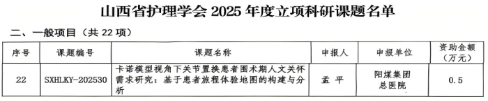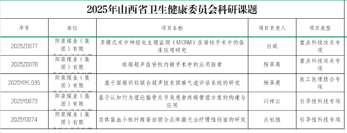 根据山西省卫生健康委员会、山西省护理学会关于申报2025年度科研课题的要求,阳煤总医院精心组织相关临床科室,结合自身优势和临床需求进行积极申报。经过多次讨论、修改和严格筛选后,最终遴选出10项科研课题进行申报。