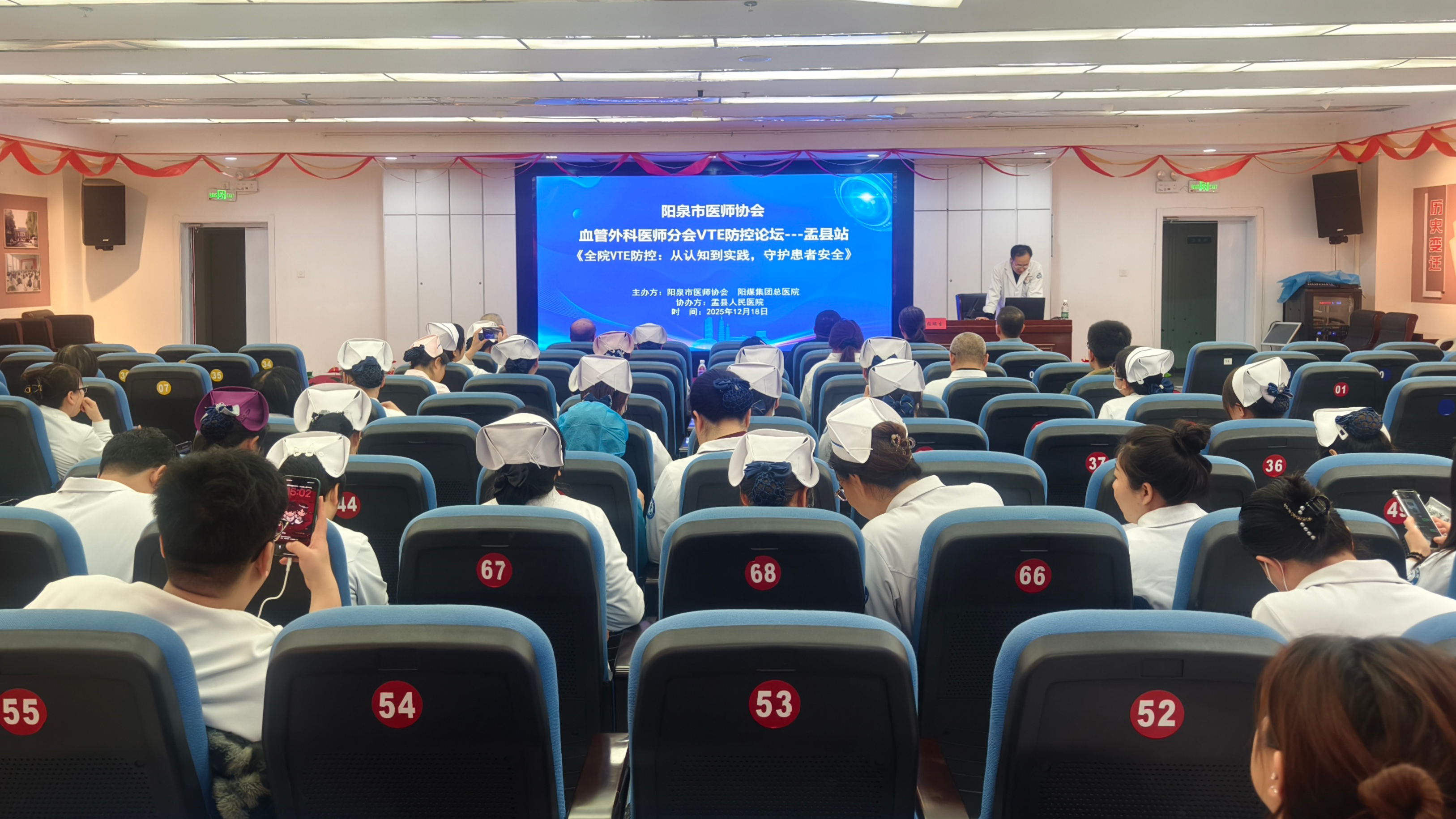 学术环节聚焦实用,内容详实。阳煤总医院三位专家分别作专题报告:田伟主任系统讲解了深静脉血栓的防控与治疗,涵盖发病机制、风险评估及综合干预策略;王鹏副主任医师围绕主动脉夹层,结合病例介绍了分型意义、急诊诊断与治疗选择;张青春护士长从护理角度阐述了VTE预防措施,包括基础、物理和药物预防的规范实施,突出护理评估与健康教育的重要性。