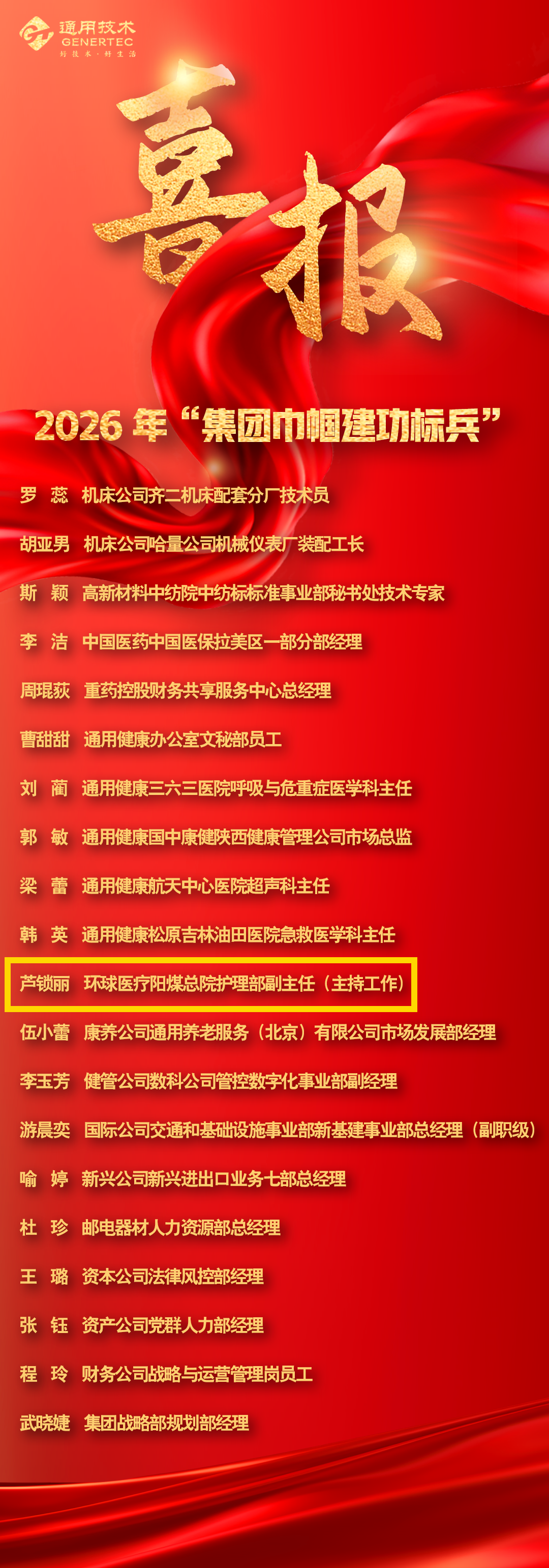 近日,通用技术集团2026年“集团巾帼建功标兵”表彰名单公布,阳煤总医院护理部负责人芦锁丽榜上有名。