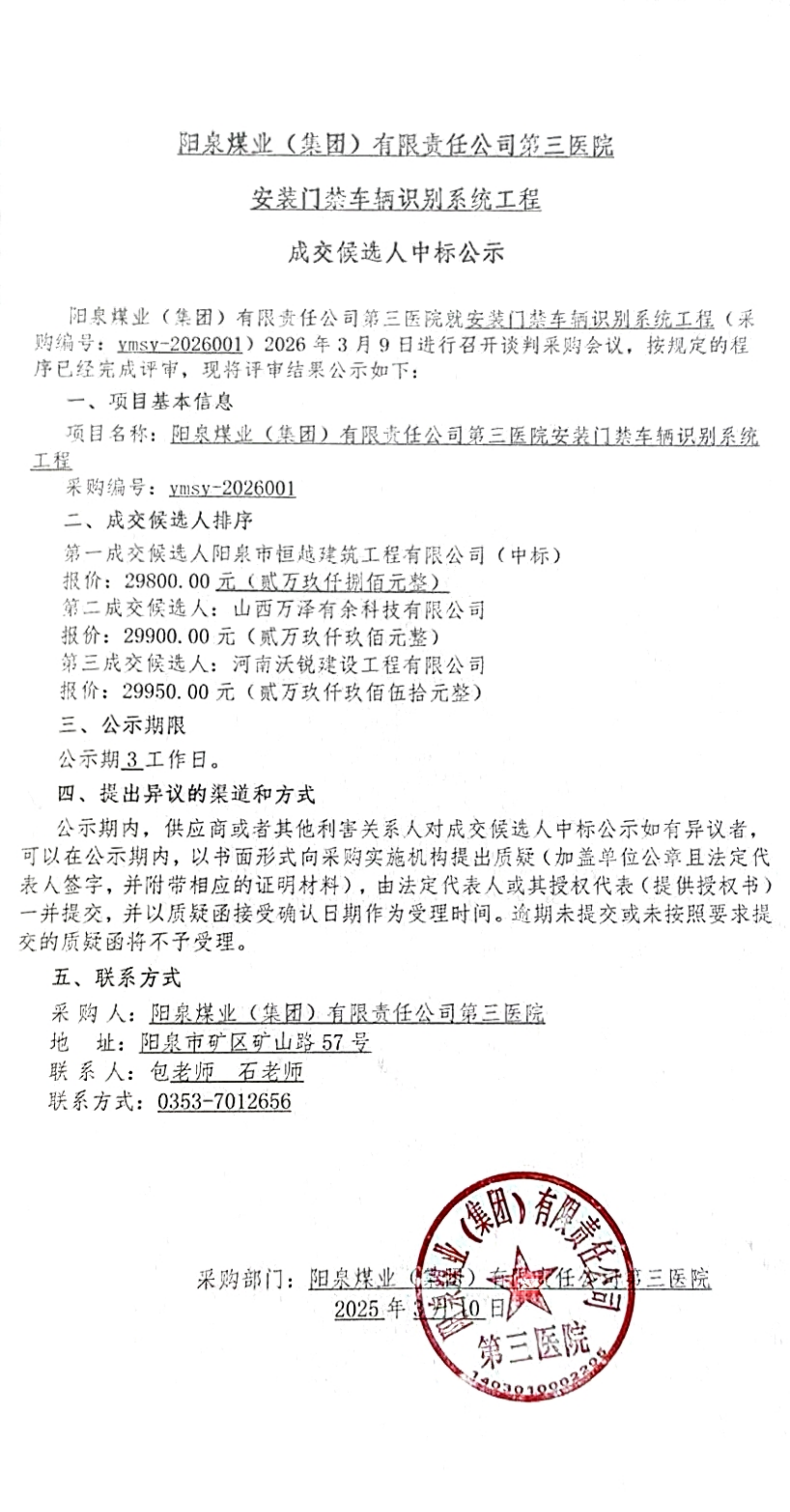 阳泉煤业(集团)有限责任公司第三医院安装门禁车辆识别系统工程成交候选人中标公示