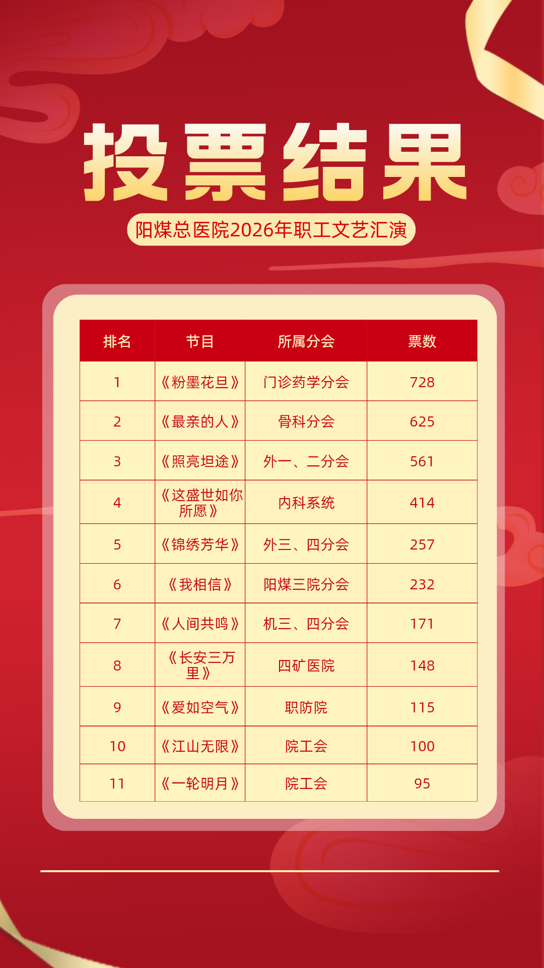 近日,阳煤总医院2026年职工文艺汇演网络投票环节圆满落幕,精彩节目的评选得到了全院职工的广泛关注与热情支持。